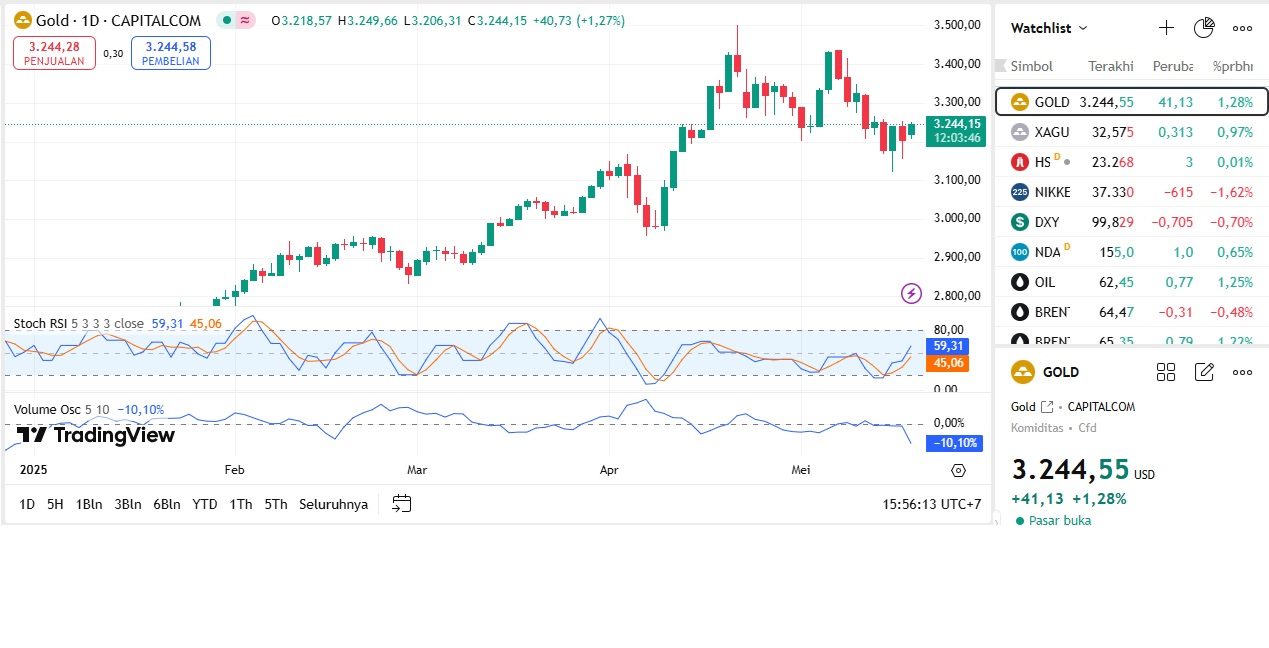 Harga emas naik pada hari Senin(19/5) karena dolar melemah dan munculnya kembali kekhawatiran perdagangan, menyusul penegasan ulang Menteri Keuangan AS Scott Bessent atas ancaman tarif Presiden Donald Trump, yang memicu permintaan safe haven.
