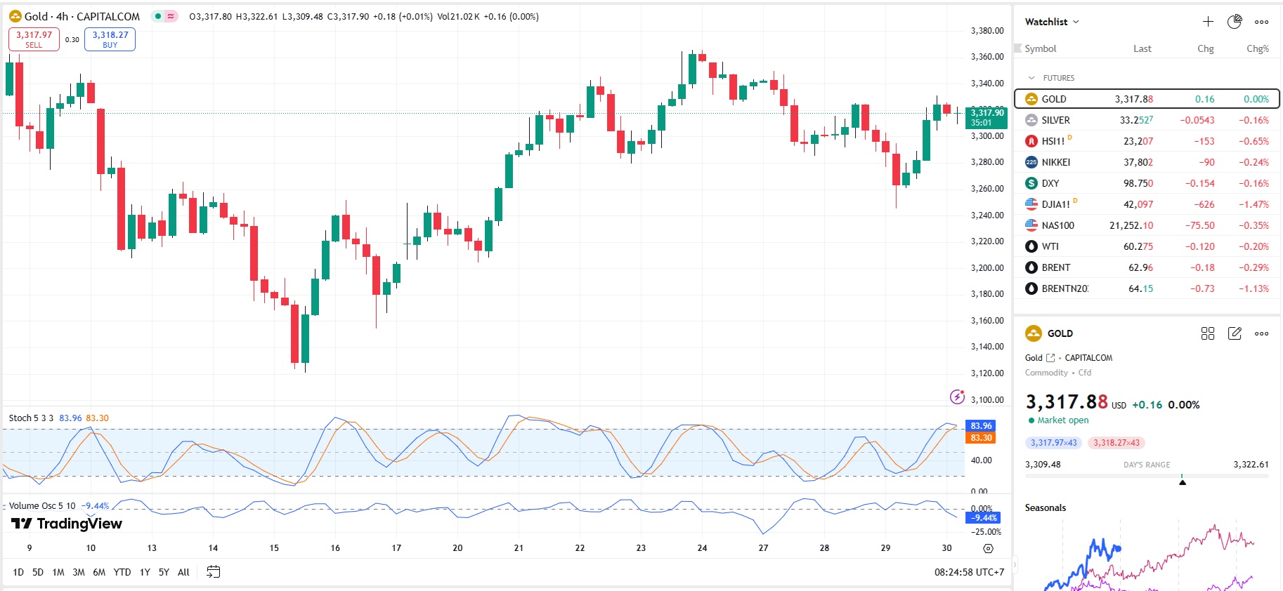 Emas naik diawal sesi perdagangan Asia (30/05) setelah pengadilan banding federal menawarkan Trump penangguhan sementara dari putusan yang mengancam akan membuang sebagian besar agenda tarifnya. Pelemahan dolar juga membantu, didorong oleh meningkatnya risiko fiskal dan tekanan politik baru pada Federal Reserve untuk menurunkan suku bunga.