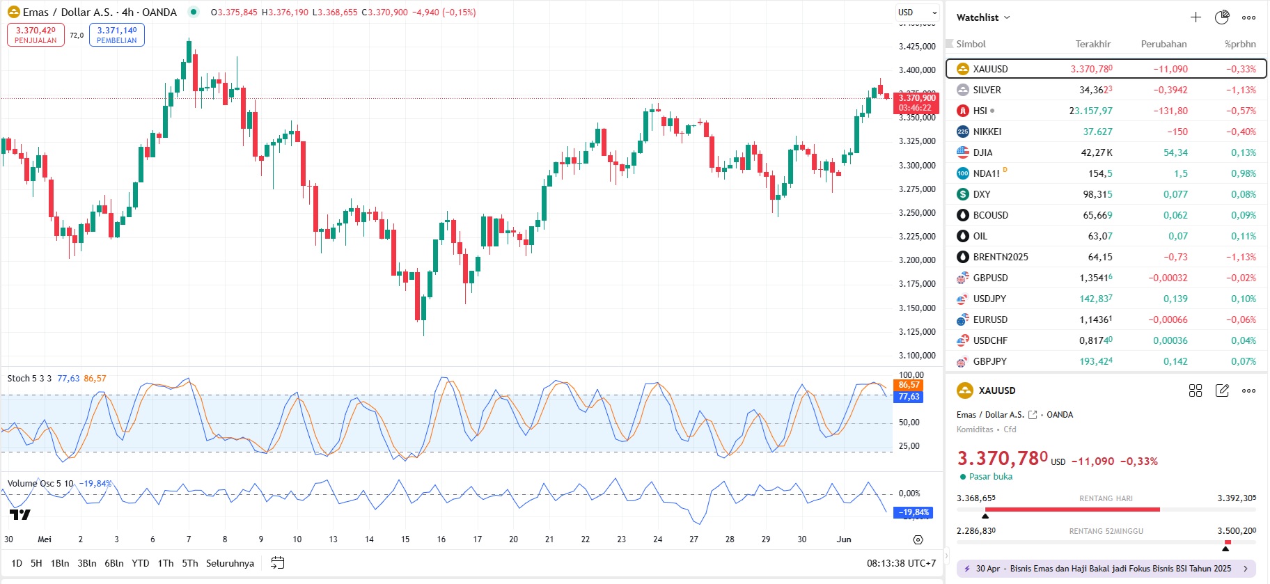 Emas melanjutkan kenaikannya pagi ini (03/6) diiringi melemahnya dolar dan permintaan yang lebih kuat untuk aset safe haven karena risiko perdagangan dan geopolitik.