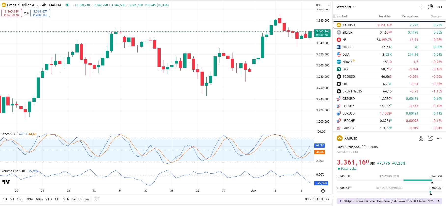 Harga emas bergerak di area $3361 di awal sesi perdagangan Asia pada (04/06) setelah mengalami penurunan lebih dari 1% pada hari Selasa pasca data pekerjaan dari Amerika Serikat (AS), yang mengungkapkan bahwa pasar tenaga kerja tetap ketat.