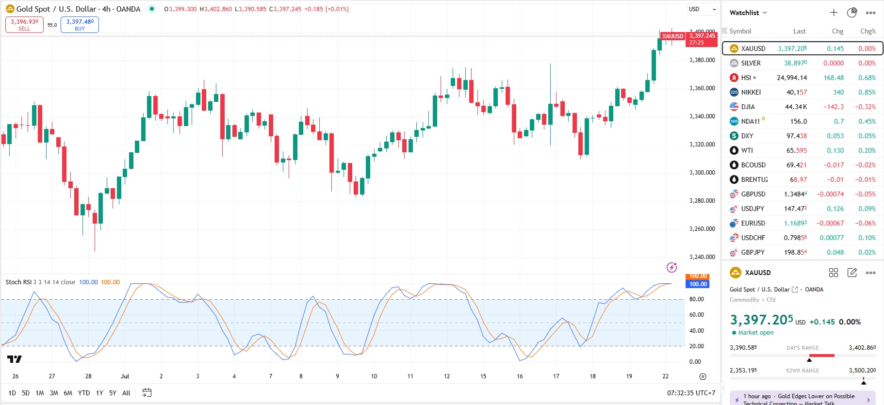 Harga emas bertahan dekat level tertinggi bulanan di $3.395 per ounce, didukung meningkatnya permintaan aset aman menjelang tenggat tarif AS 1 Agustus. Pernyataan Gedung Putih bahwa Presiden Trump mungkin akan mengeluarkan lebih banyak surat tarif sepihak meningkatkan ketidakpastian pasar. Dolar AS melemah 0,5% di sesi sebelumnya, membuat emas lebih menarik secara relatif bagi pembeli global.